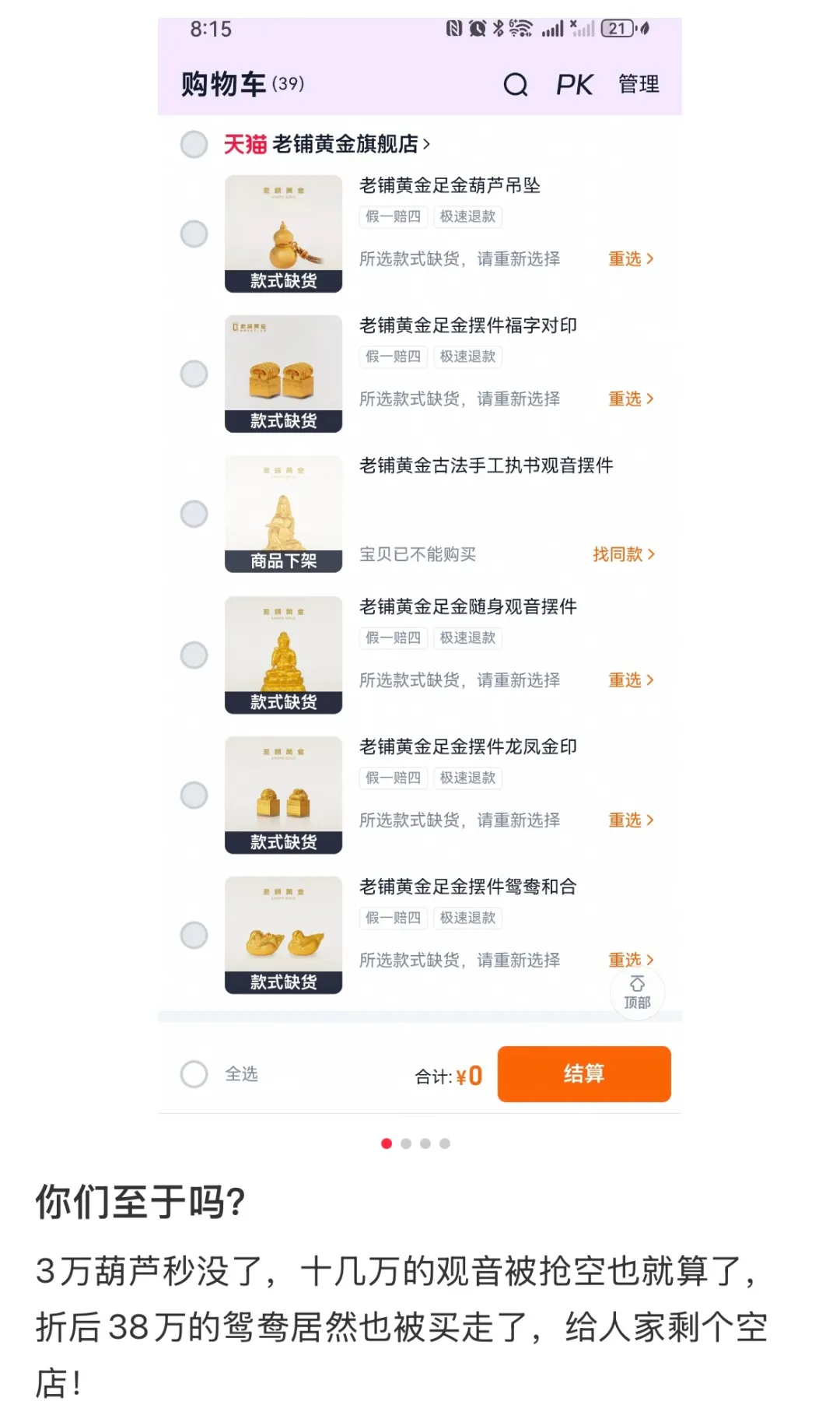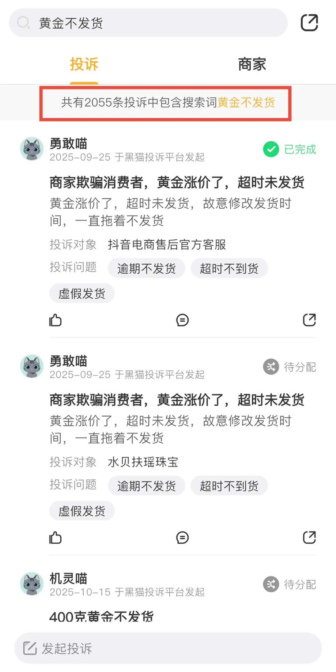 张先生看到无法退货,那就等着发货。谁知长假都过完了,一直没有发货,10月8日他又去找店家,告诉他黄金价格涨得太多,加上平台要抽成,“这个价格没法发货。”